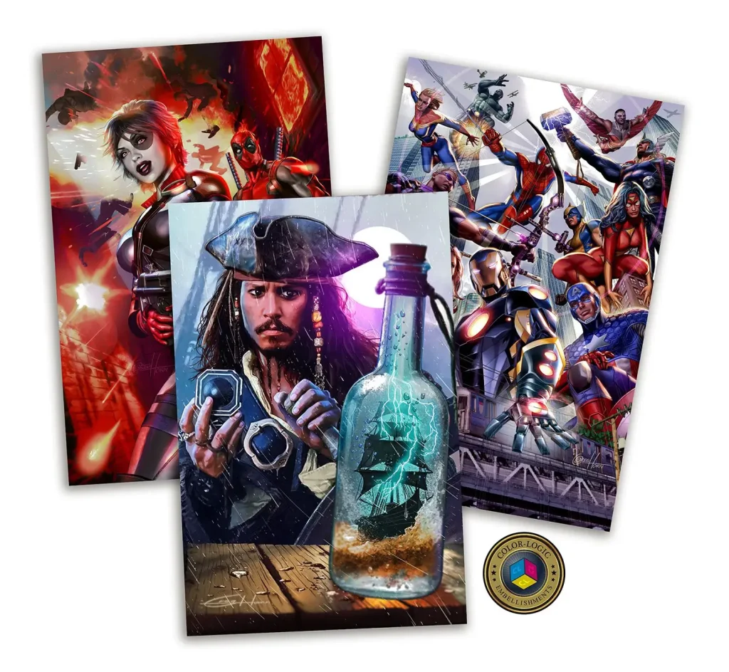 One example is a painting I did of Johnny Depp from “Sleepy Hollow.” The background is blue, and they added foil effect to that blue. The way it hits the light is otherworldly. Honestly, I think it looks better than what I see on my computer screen.